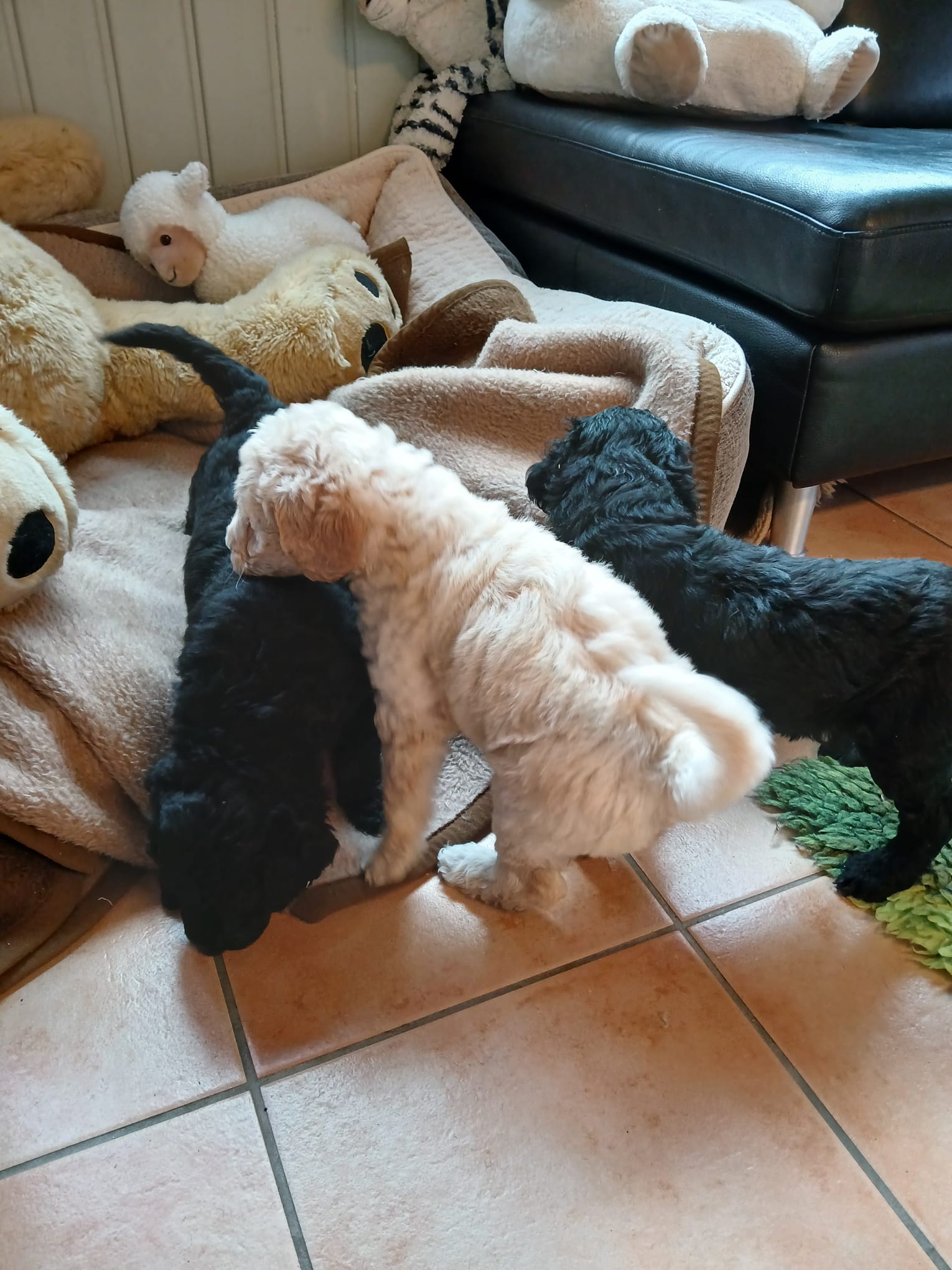 Ab der dritten Woche lernen die Labradoodle-Welpen den Rest unseres Rudels kennen. Sobald sie ein bestimmtes Alter erreicht haben und das Wetter es zulässt, können sie unseren Garten erkunden. Dort lernen sie unter anderem schnell sauber zu werden. Unsere Welpen werden geimpft, gechipt und entwurmt abgegeben.